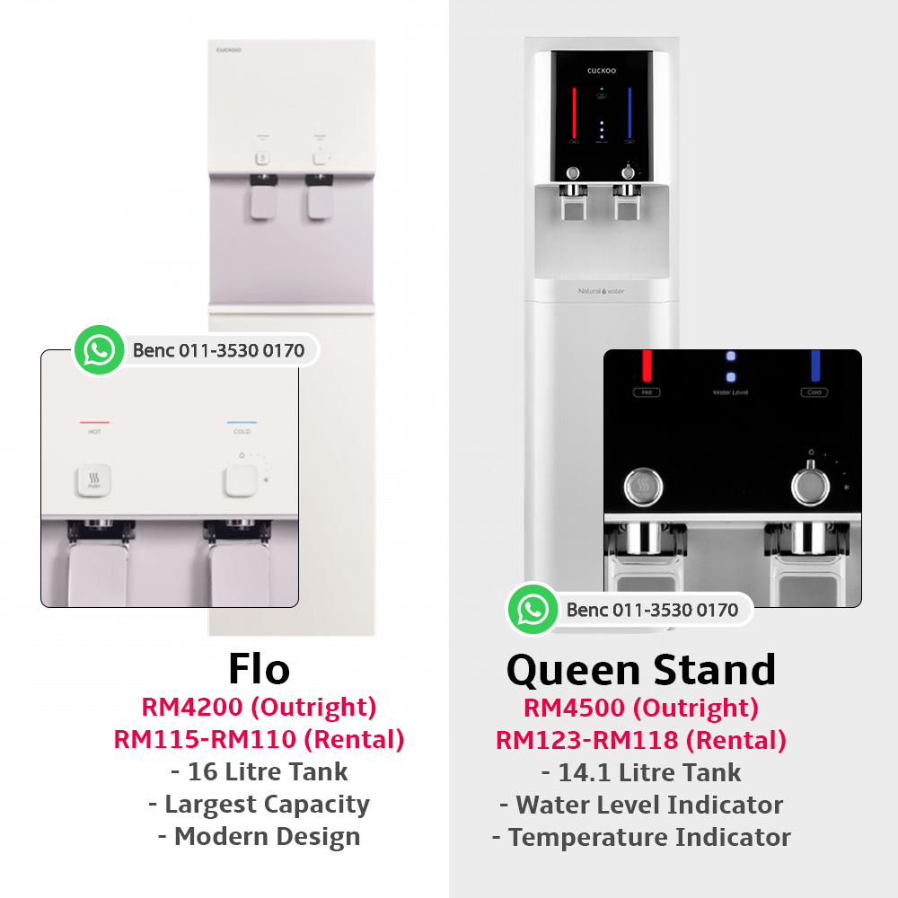 It shouldn’t break your bank to drink big. Choose from 6 different packages and decide on your monthly fee and repayment period for your brand-new CUCKOO Queen Stand mild-alkaline water purifier! Also receive FREE servicing and filter replacement every four months, as well as a 5-year warranty!